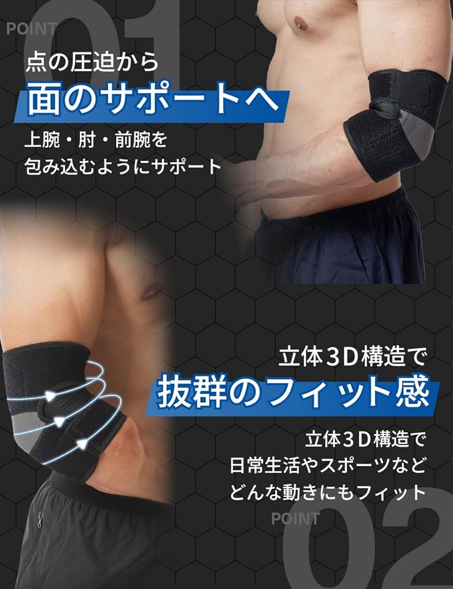 局所的な点の圧迫ではなく、広範囲でしっかり支えることで、快適なフィット感を実現する肘サポーター。
