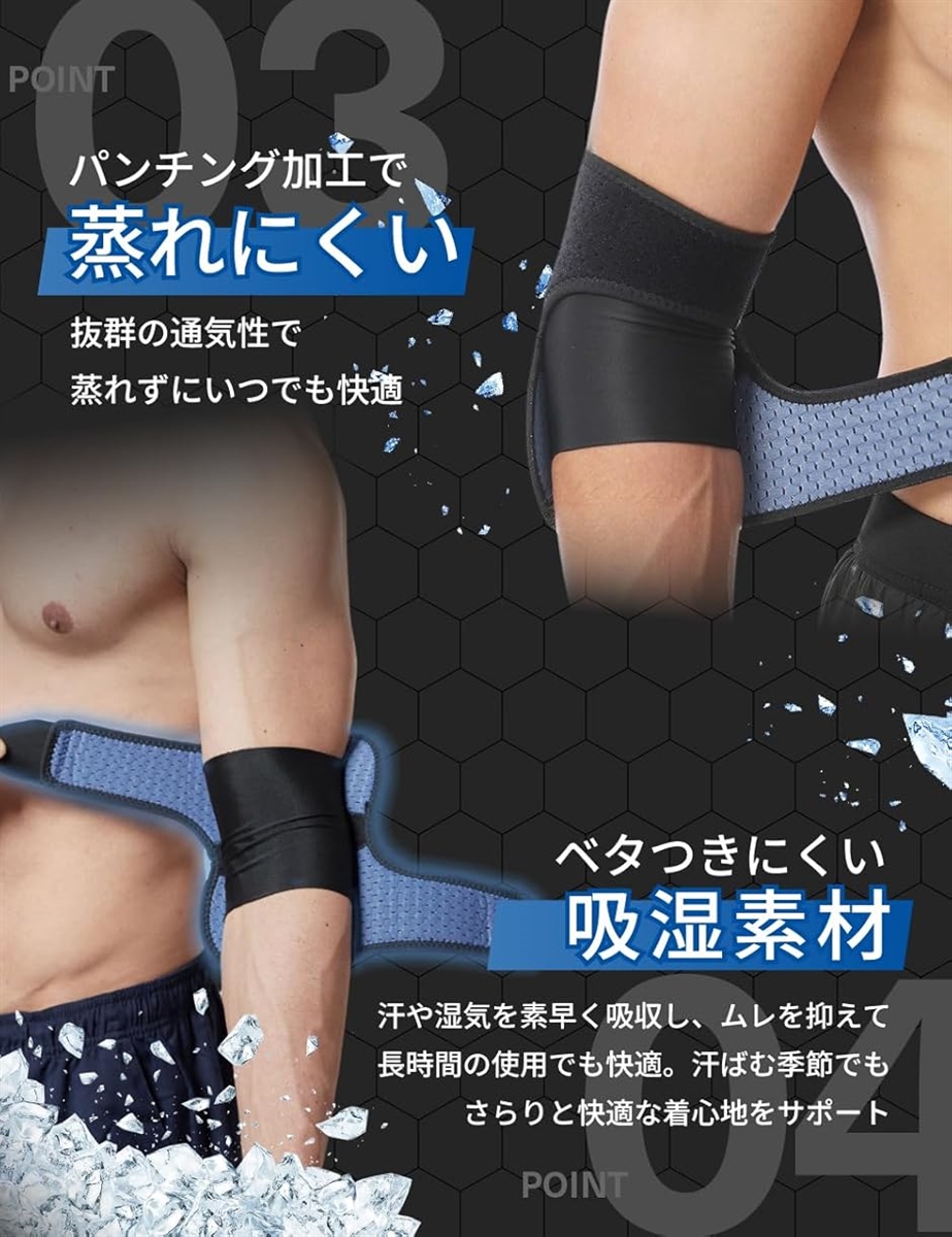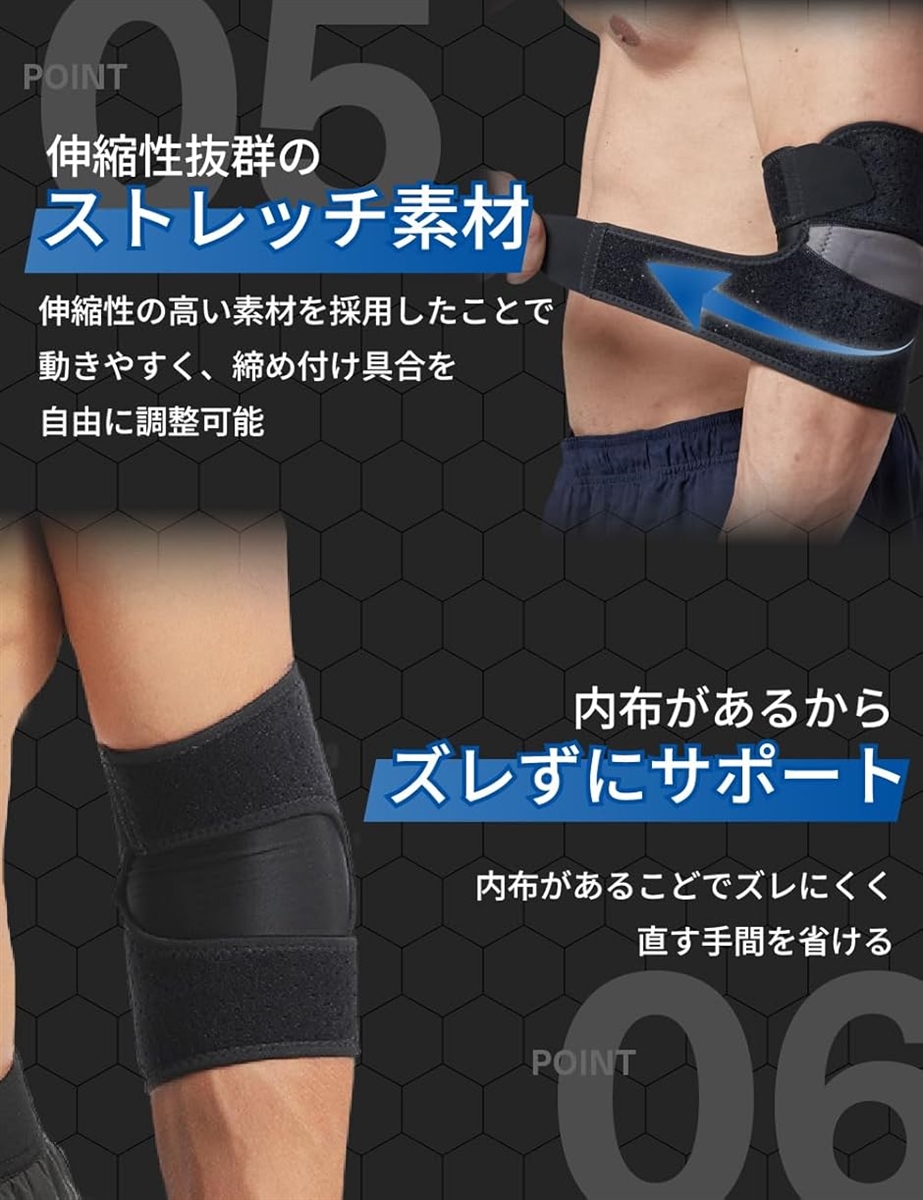 ズレにくく、長時間着用しても快適なエルボーバンド。