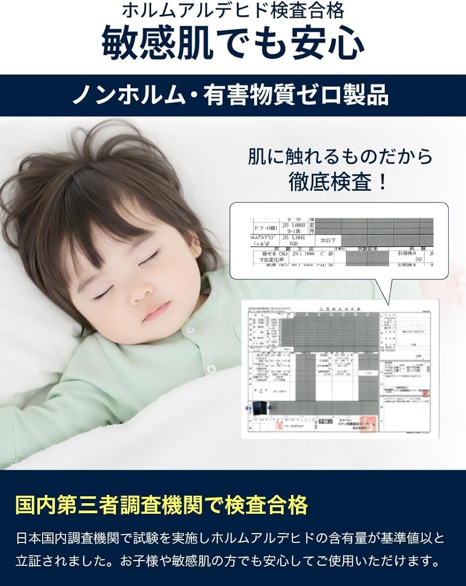 「敏感肌にも安心の低刺激仕様」 国内第三者機関にてホルムアルデヒド検査に合格した、有害物質フリーの素材を使用。