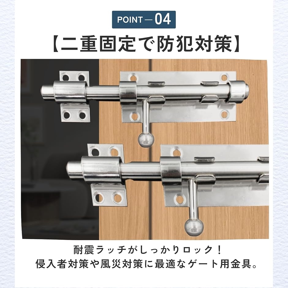 「二重固定で防犯対策」耐震ラッチがしっかりロック。侵入者対策や風災対策に最適なゲート用金具。