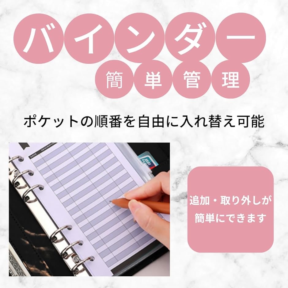 「バインダー式で簡単管理」バインダー式の家計簿なので、ポケットの順番を自由に入れ替えたり、追加・取り外しが簡単にできます。