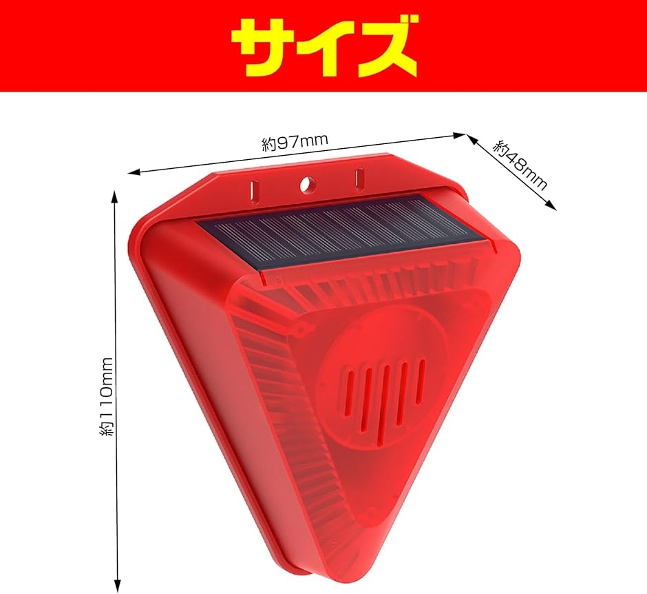 「内容」1個「動作モード(4種類)」モード1:24時間動作、10分間隔/モード2:24時間動作、20分間隔/モード3:夜間のみ動作、10分間隔/モード4:夜間のみ動作、20分間隔「基本仕様」アラーム音量:129dB/アラーム音の長さ:15秒/防水レベル:IP55