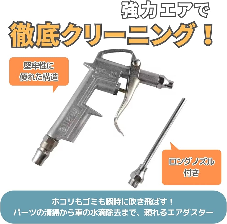 エアホースで作業範囲をしっかり確保し、エアダスターガンでホコリや汚れをパワフルに吹き飛ばします。