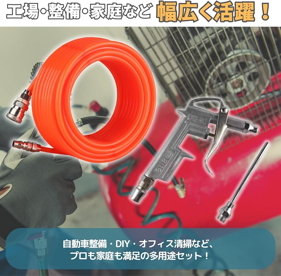 「エアホース&エアダスターセット」は、工場や自動車整備、自宅やオフィスの清掃など、幅広いシーンで活躍します。