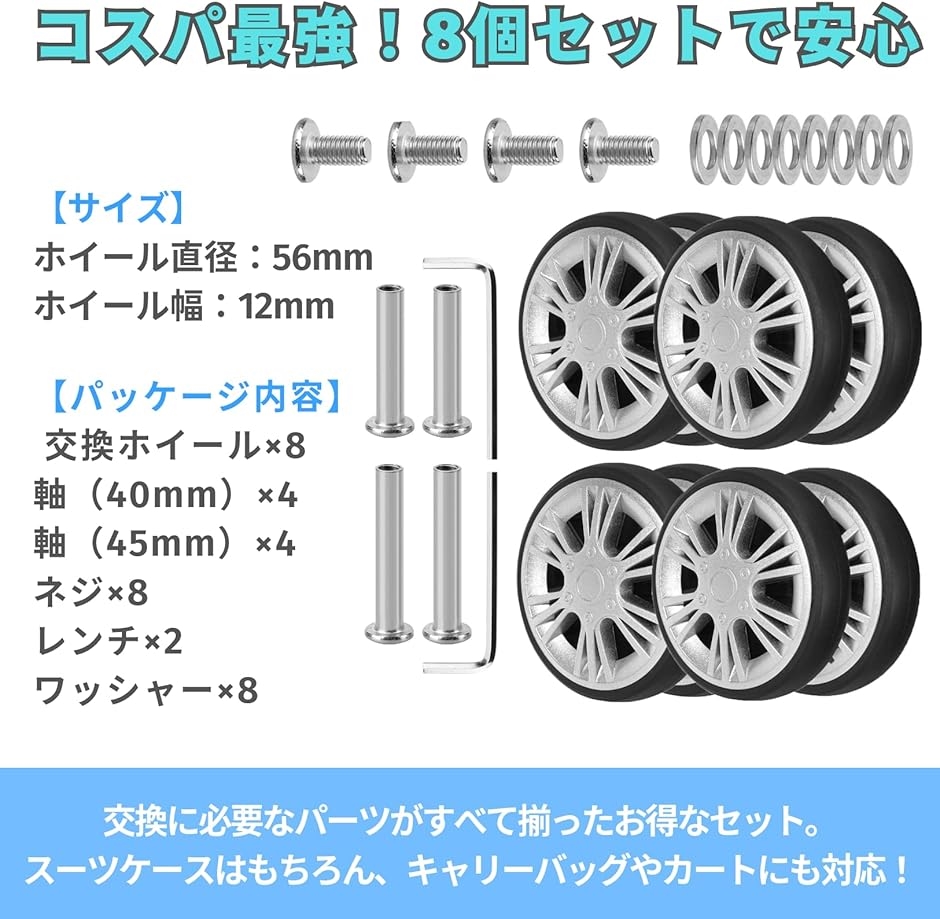 「8個セットでお得&便利」 パッケージには交換用ホイール8個に加え、40mmと45mmの軸、ネジ、ワッシャー、専用レンチ2本が含まれています。