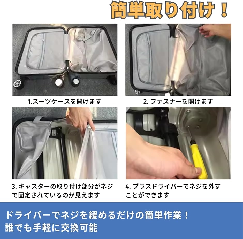 本商品は、ご自身で簡単に交換できるスーツケース用キャスター交換キットです。