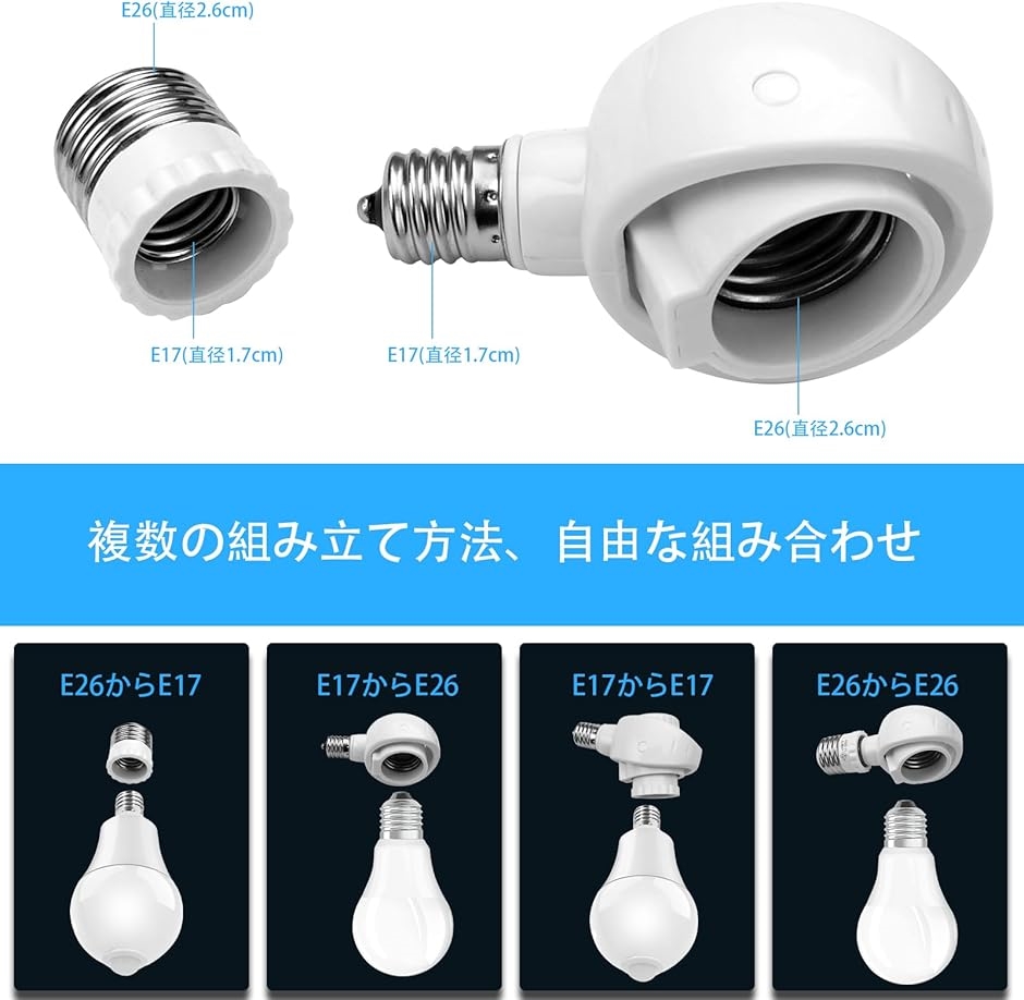 | 商品名 | くみあわせがたE26>E26 E17>E17変換ソケット 可動 角度の可変式ソケット LED電球専用 斜め付けダウンライトに直下方向に取付可能 センサーが十分に展示されていて |