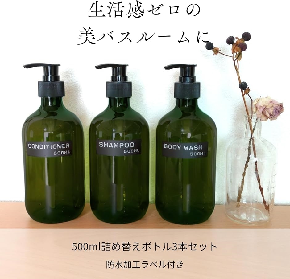 | 商品名 | シャンプーボトル 3本セット 詰め替えボトル ディスペンサー シャンプー コンディショナー ソープ 生活感を隠す クリア 500ml 防水ラベル付き グリーン |