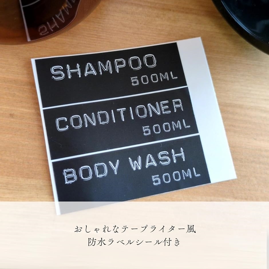 「おしゃれなテープライター風防水ラベルシール付き」SHAMPOO / CONDITIONER / BODY SOAPの3種。