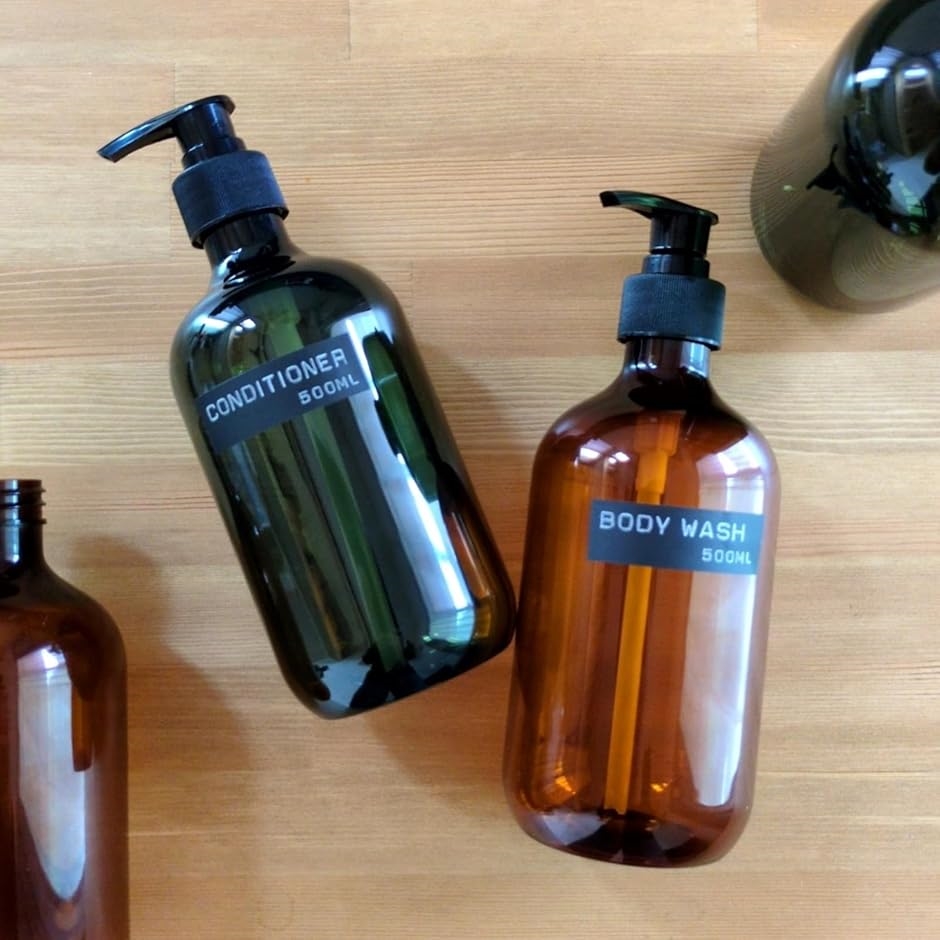 この詰め替え用ディスペンサーボトルは、アンバーガラス風の半透明デザインと洗練されたブラックラベルで、バスルームや洗面台の印象を格上げします。