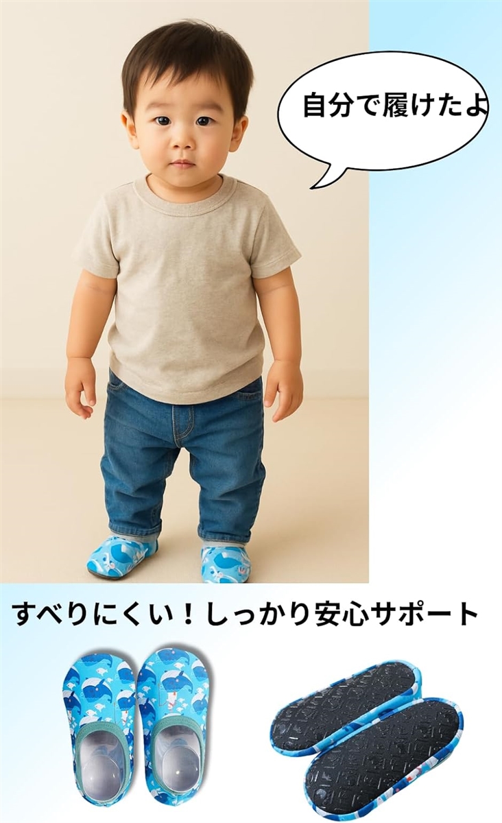 初めての海やプールデビューにぴったり。 軽くて柔らかく、サッと履かせやすく、お手入れも簡単。
