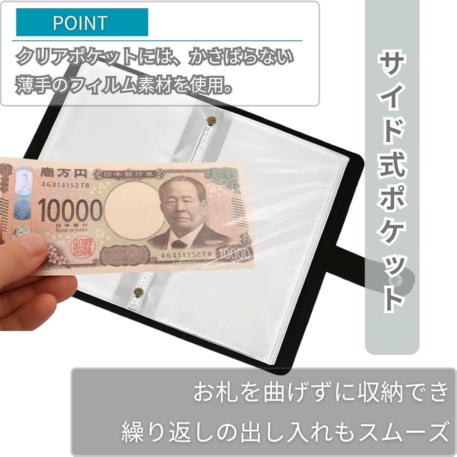 「お札100枚」50ページの透明ポケットに最大100枚のお札を収納可能。