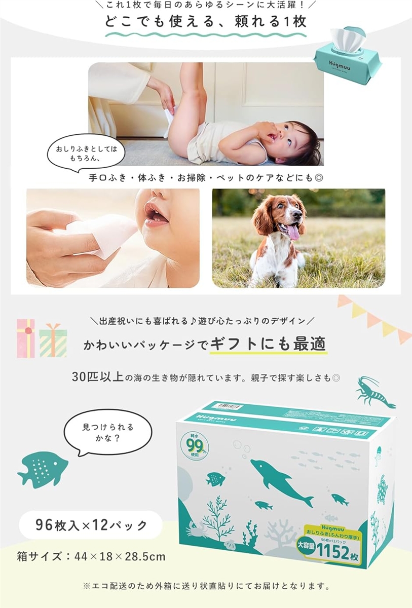 | 商品名 | おしりふき おしり拭き ふんわり厚手 水分たっぷり 大容量 蓋付き ウェットティッシュ 赤ちゃん ベビー Hugmuuハグムー 純水99% お尻拭き |