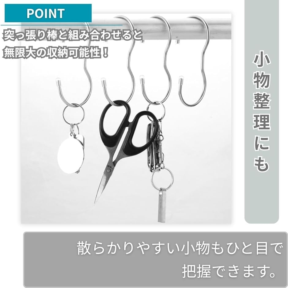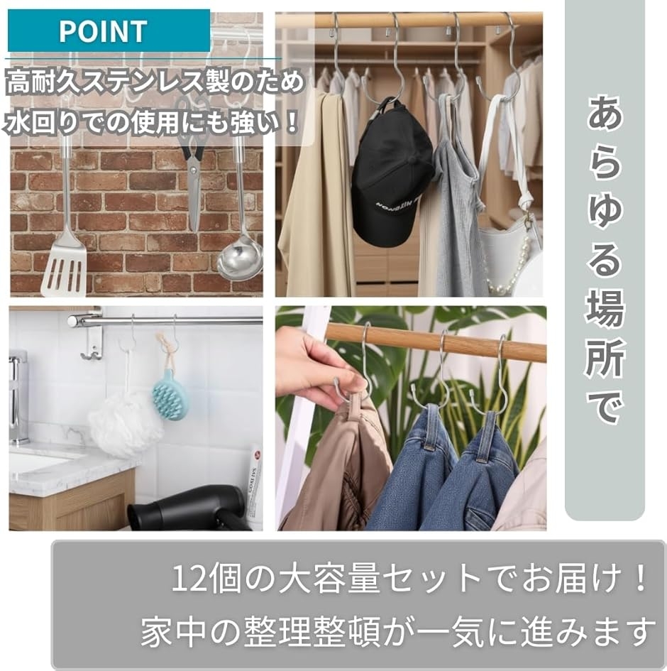 「商品内容」パッケージ内容:ねじれS字フック12個 本体サイズ(約):全長10cm 幅3.5cm 耐荷重(約):15kg 主な材質:ステンレス *サイズ詳細は商品画像をご確認ください。