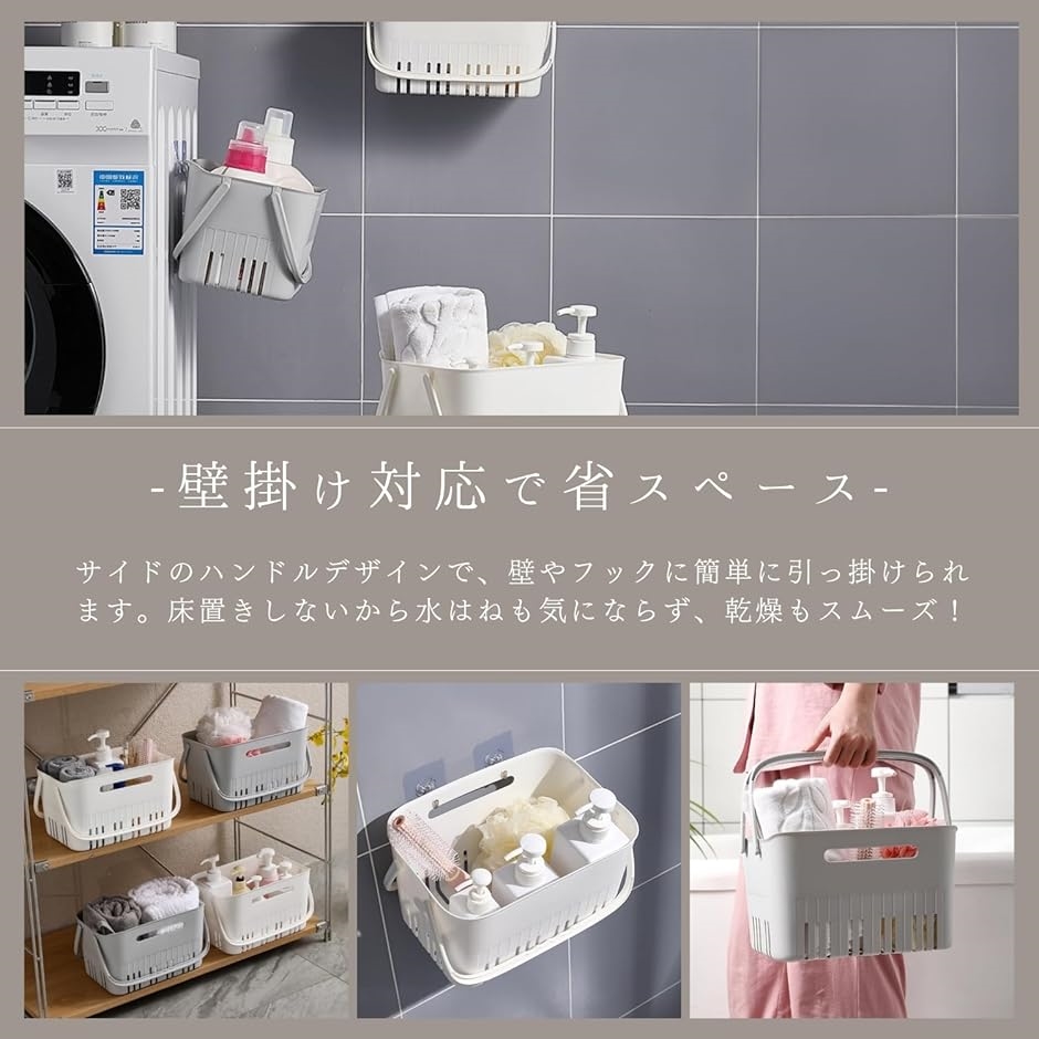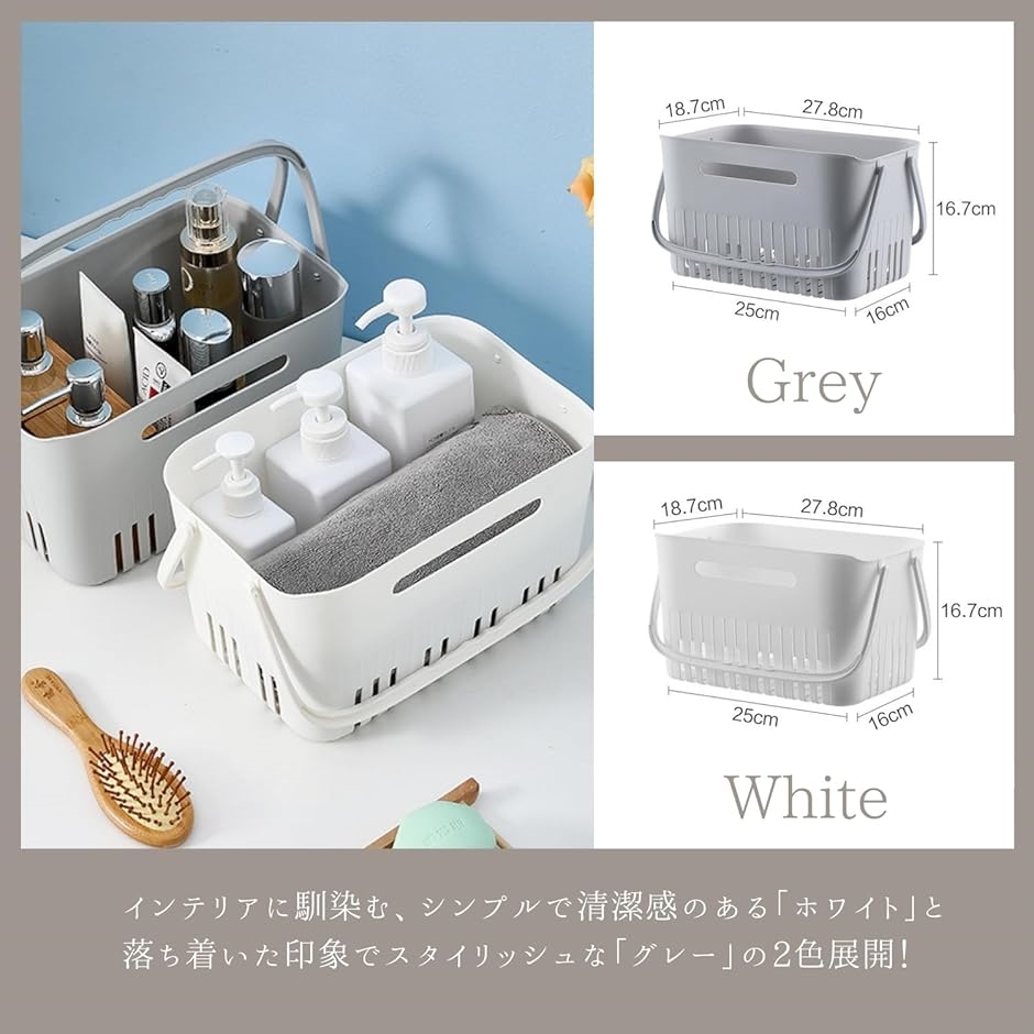 「セット内容」バスケット本体x1個 「サイズ」約25cmx16.7cmx16cm 「重量」約300g 「カラー」ホワイト グレー 「素材」プラスチック 「用途」ジム 銭湯 入浴グッズ収納 洗面所 化粧品収納 生活用品整理