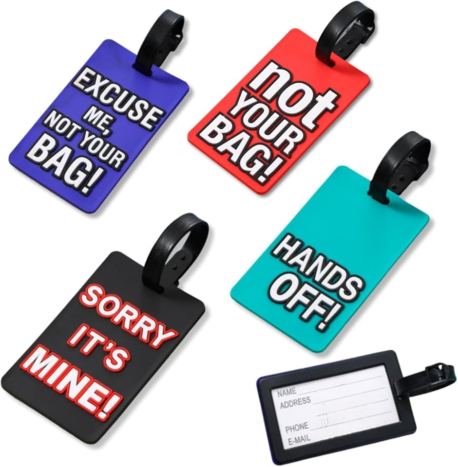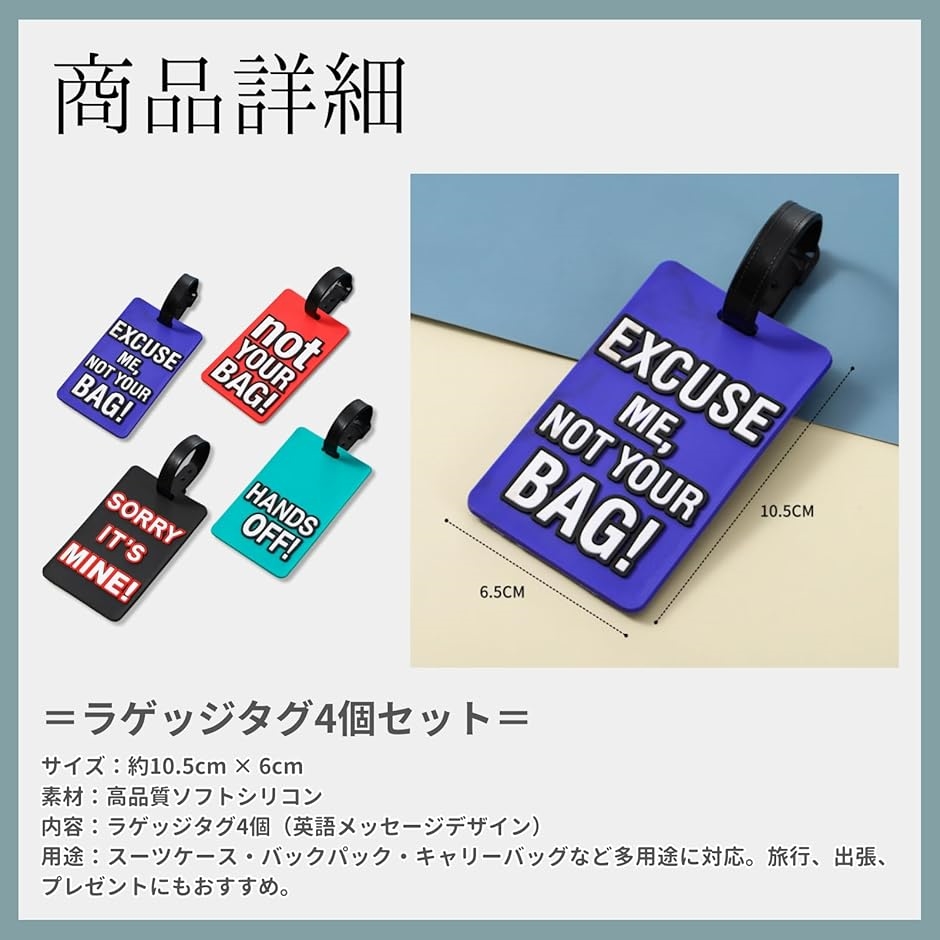 「商品詳細」 サイズ:約10.5cm x 6cm 素材:高品質ソフトシリコン 内容:ラゲッジタグ4枚(英語メッセージデザイン) 用途:スーツケース・バックパック・キャリーバッグなど多用途に対応。