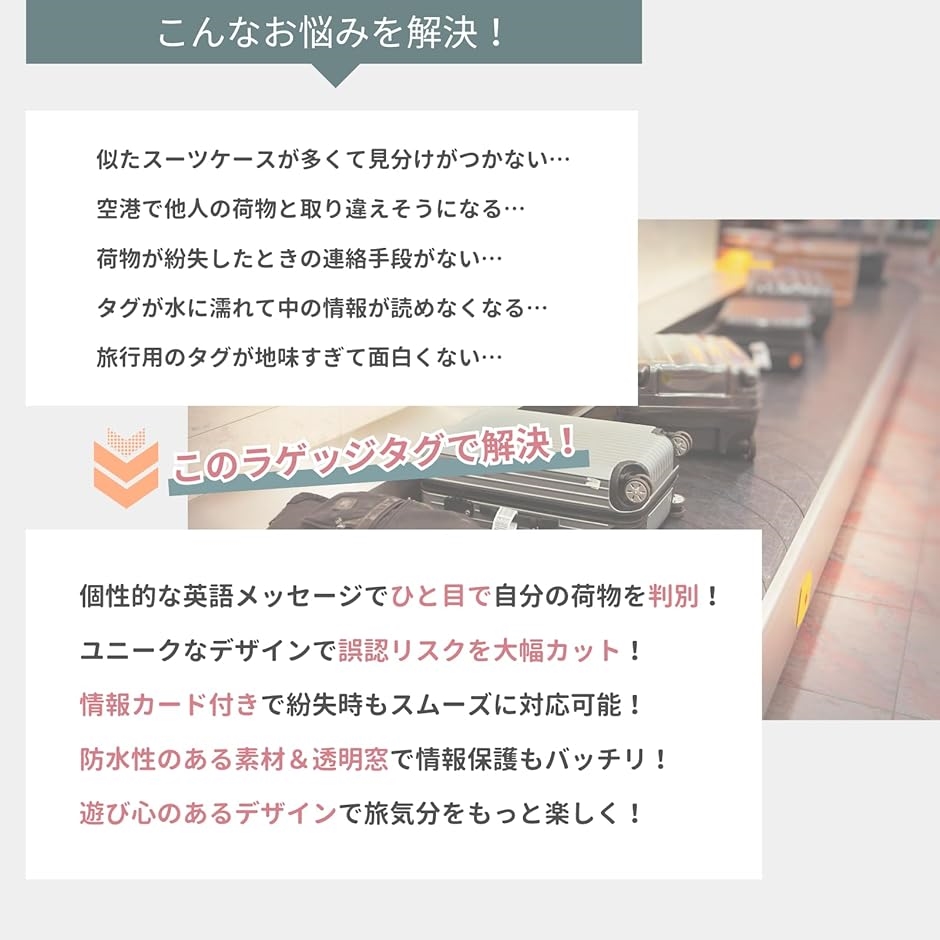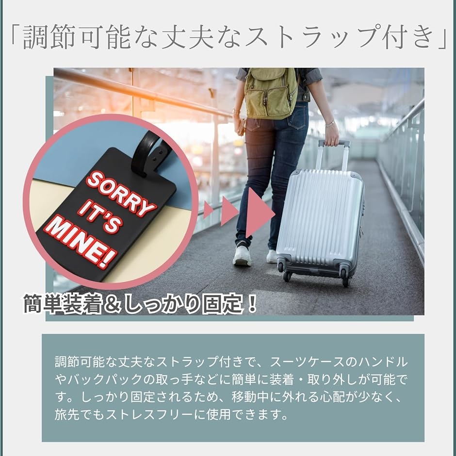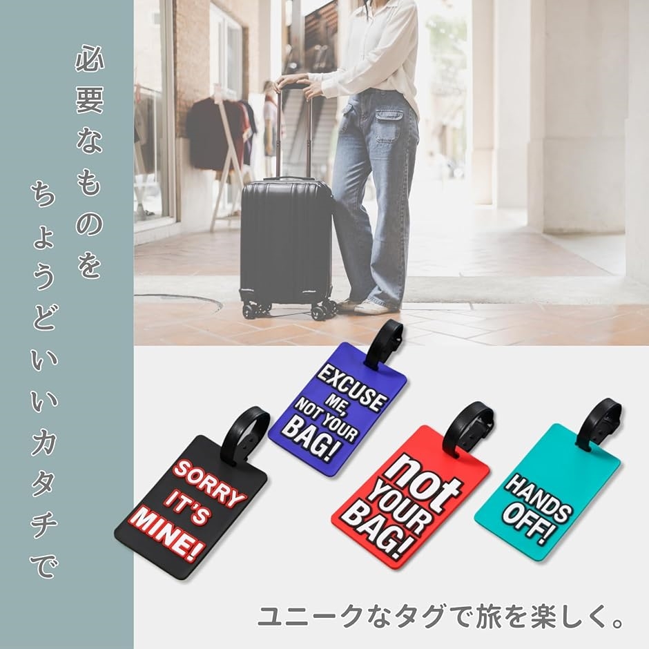 「目印になるユニークなデザイン」 ユーモアのある英語メッセージがプリントされたラゲッジタグは、空港や駅、バス乗り場など人の多い場所でも、自分の荷物をひと目で見分けることができます。