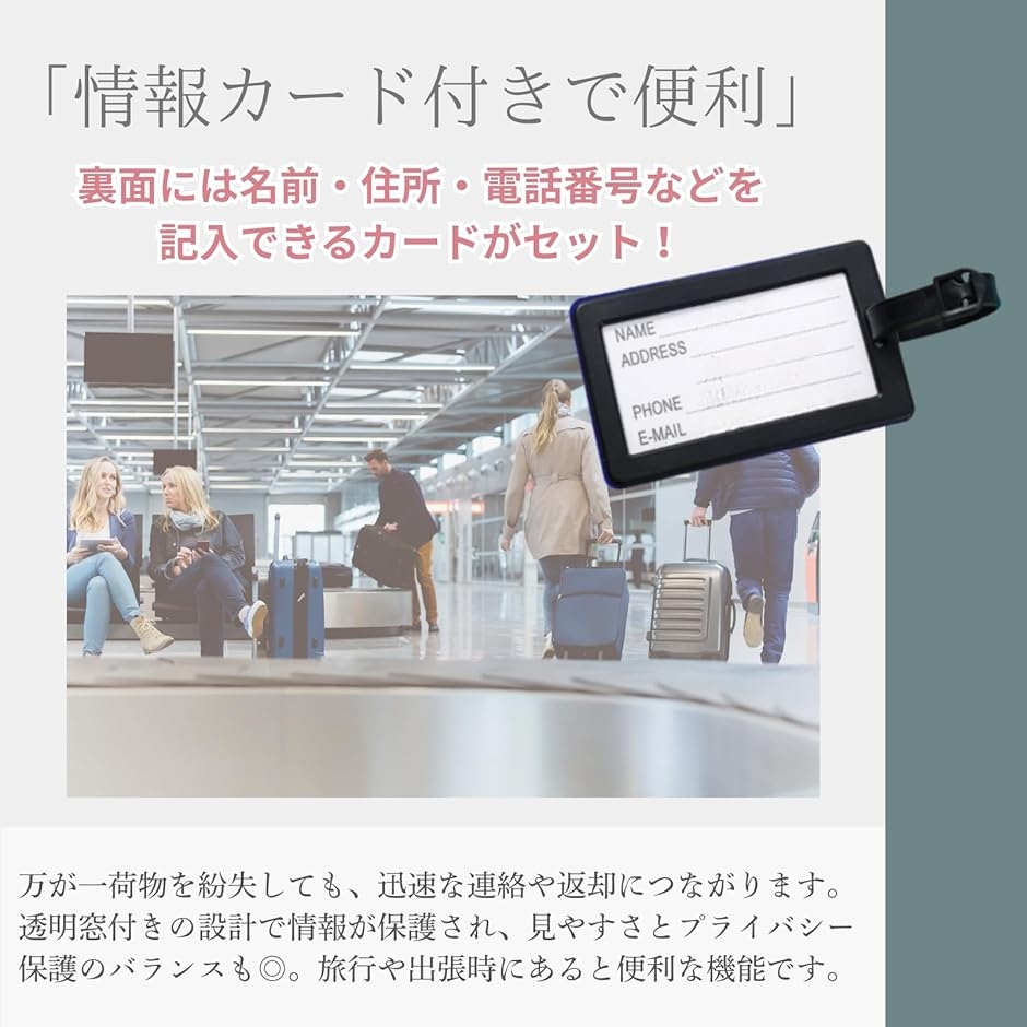 「情報カード付きで便利」 裏面には名前・住所・電話番号などを記入できるカードがセットされており、万が一荷物を紛失しても、迅速な連絡や返却につながります。
