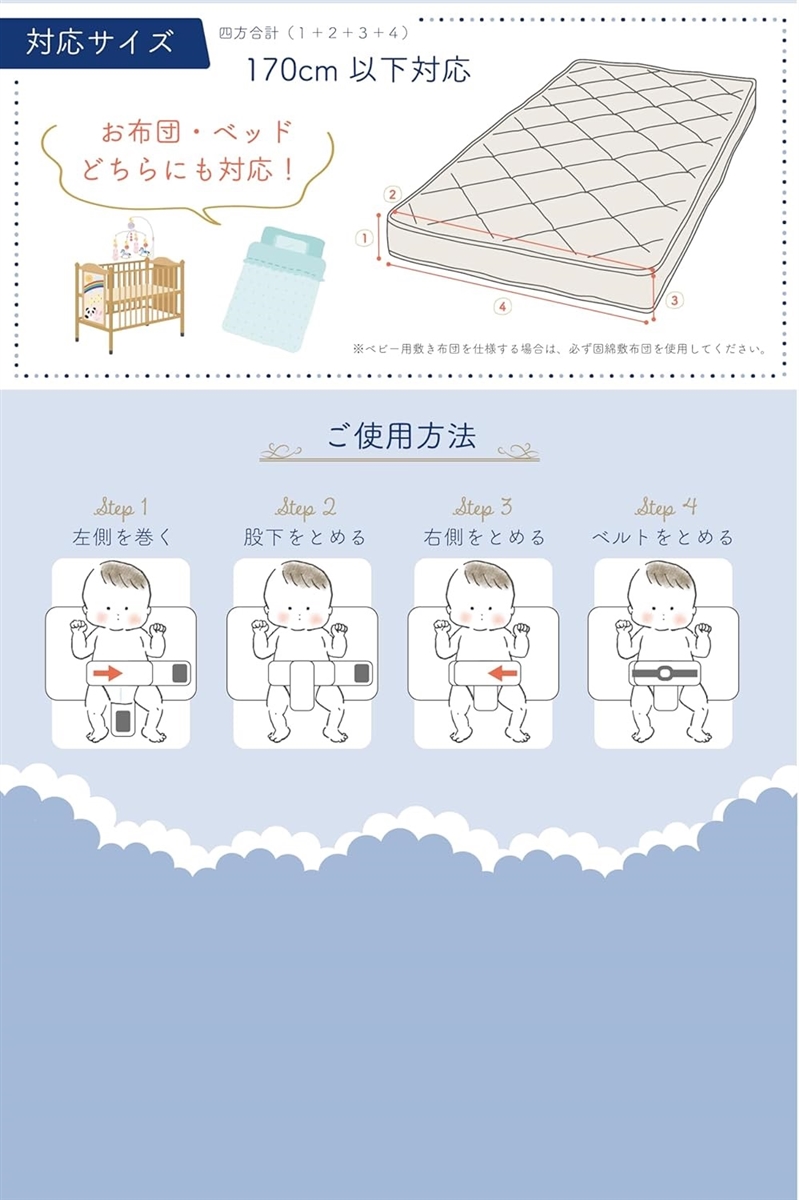 | 商品名 | 睡眠指導士監修Sleep Belt 寝返り防止ベルト うつ伏せ防止 うつぶせ寝対策 簡単取り付け 洗濯OK 赤ちゃん ベビー 綿100% 出産祝い おくるみ 取扱説明書付 |