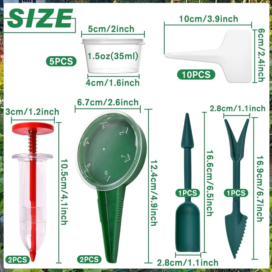パッケージに含まれるもの:緑の5速ハンドヘルドシードスプレッダー2個、赤のミニ播種種子ディスペンサー2個、苗移植ツール2個、透明な丸い種子収納ボックス5個、T型植物ラベル10個