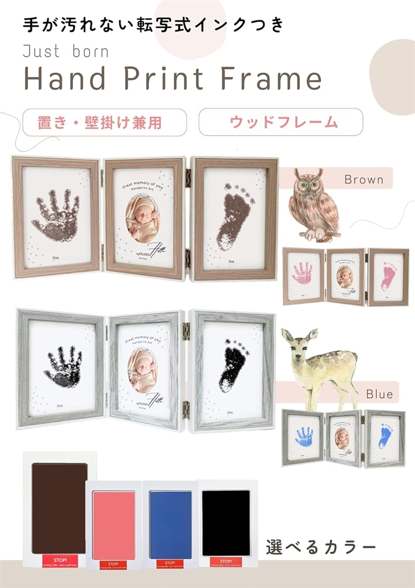 軽量フレームで安心、インクパッド式で簡単、そしてなんといっても素敵なカラーが選べることが特徴です ピンク ブルー ブラウン ブラック どのカラーもとてもかわいいのでおすすめです フォトフレーム 手形スタンプ 赤ちゃん 写真立て 汚れない 手形足形 置き掛け兼用 ベビーフレーム 出産祝い 命名書 ベビー用品 ジャストボーン