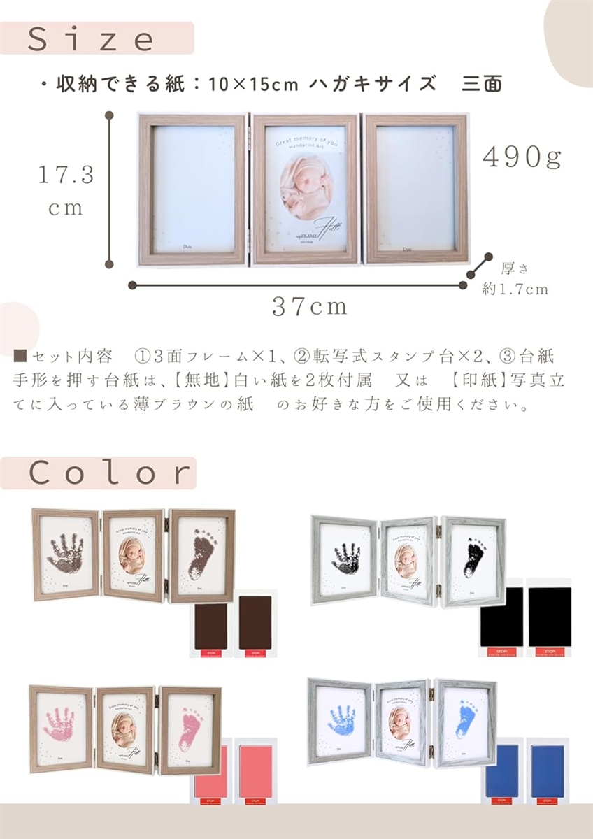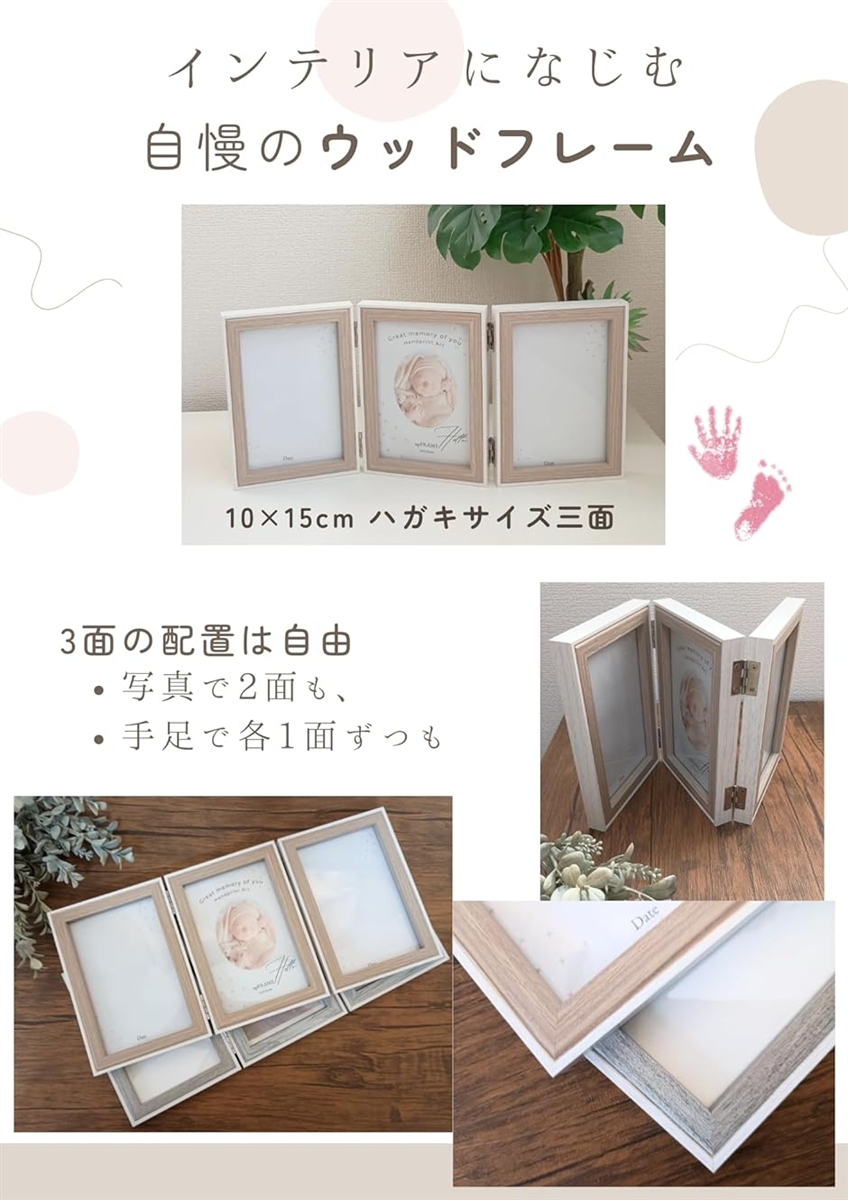 | 商品名 | 手形スタンプ フレーム セット 置き掛け兼用 手形足形 汚れない おしゃれ 木製 ウッド 三面 写真立て 赤ちゃん 手足 ベビーフレーム 出産祝い |