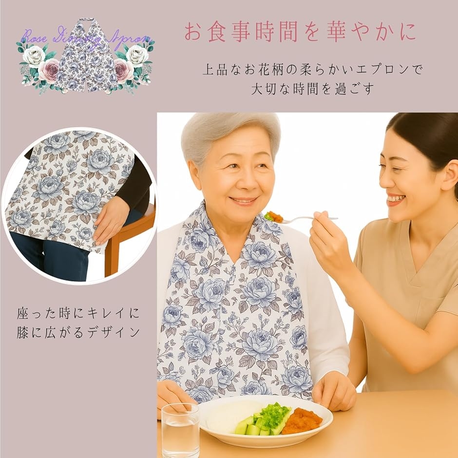 「大切な食事の時間を華やかに」 日々の食事の時間を、より華やかで快適なものに変える介護用エプロンです。