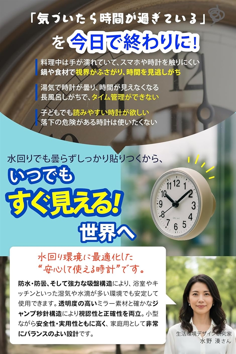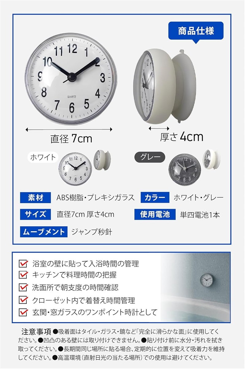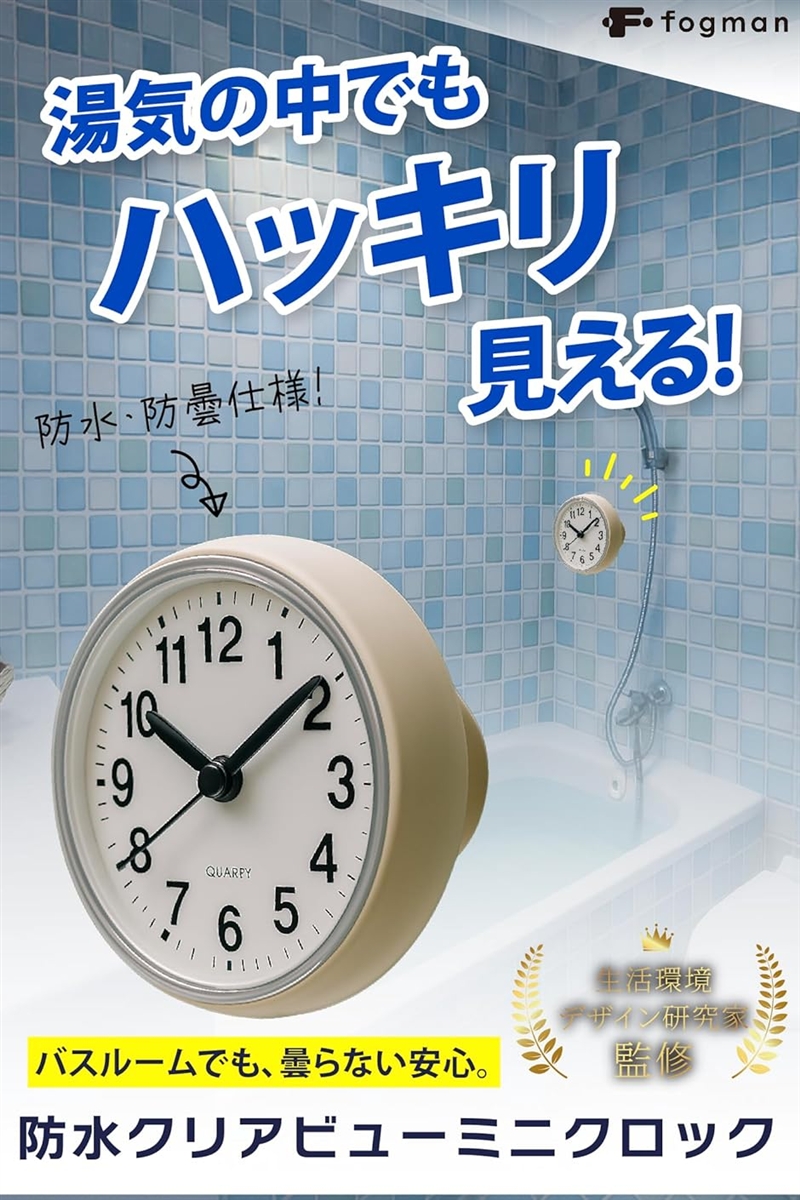 | 商品名 | 時短生活コーディネーター監修 防水時計 お風呂用 マグネット 掛け時計 吸盤付き 浴室 置き時計 アナログ 小型 |