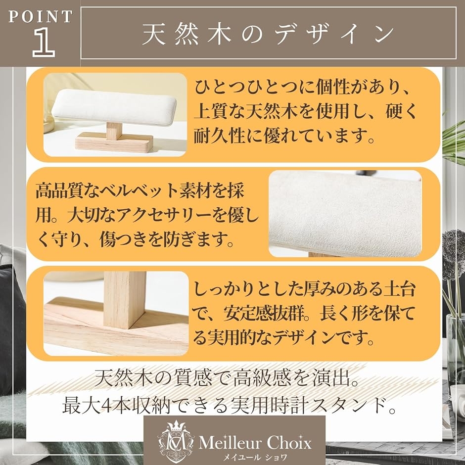 「天然木のデザイン」 天然木を使用した時計スタンドは、美しい木目と上質な質感で、大切な腕時計を引き立てます。