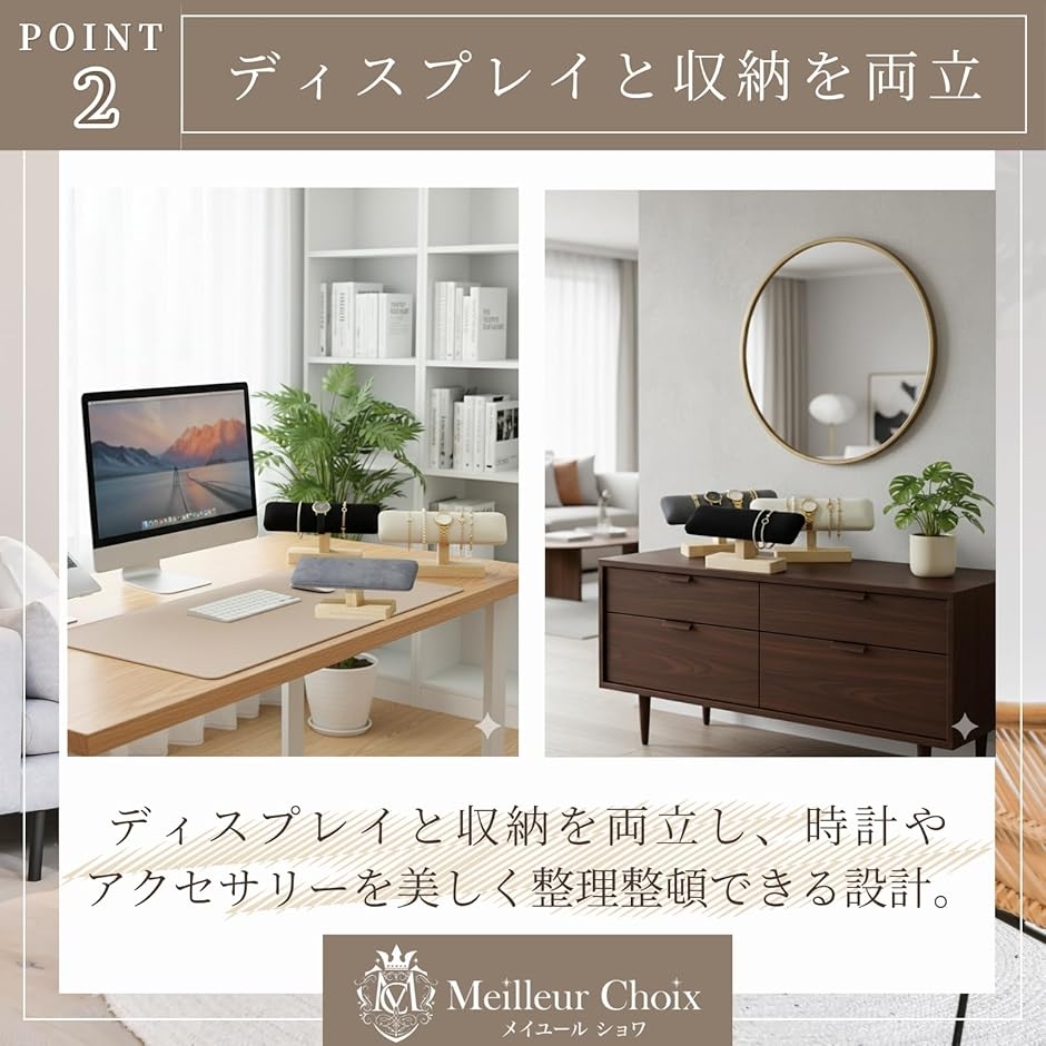 外した腕時計を引っかけるだけで簡単にディスプレイでき、最大4本まで掛けられる実用性も魅力です。