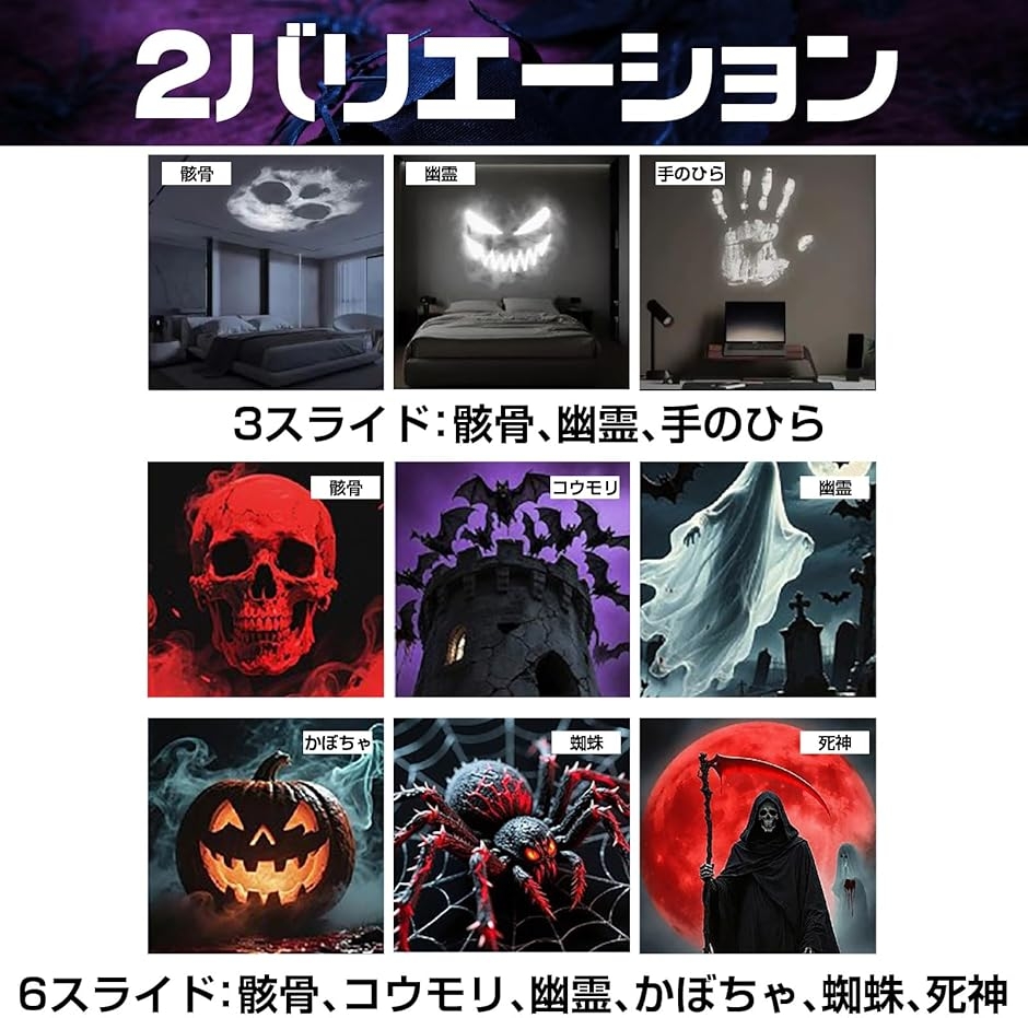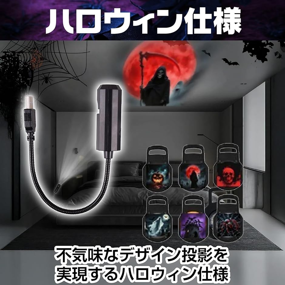 「ハロウィンの雰囲気を一瞬で演出」 USBプロジェクターを使用すれば、壁や天井に幽霊、カボチャ、ドクロ、クモ、コウモリなどのハロウィンモチーフを簡単に投影可能。