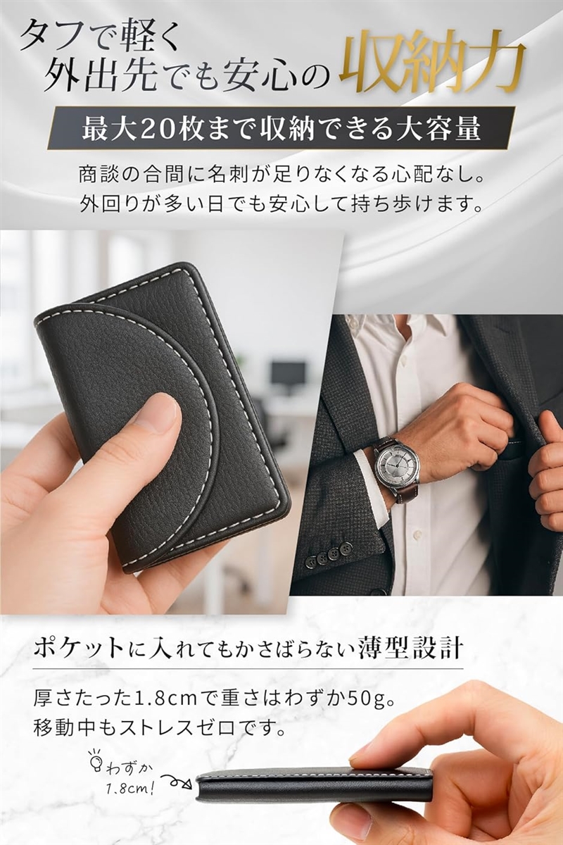 「大容量なのにスリムなデザイン」名刺を10〜20枚までしっかり収納できるにもかかわらず、厚さはわずか1.8cmという驚きのスリム設計。