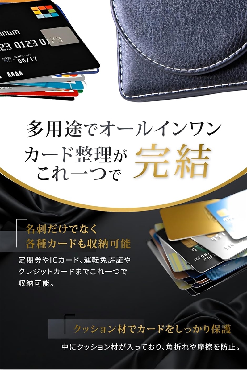 「多用途に使えるカードケース機能」名刺だけでなく、交通系ICカードやクレジットカード、運転免許証、保険証など、日常使いするカード類をまとめて収納可能。