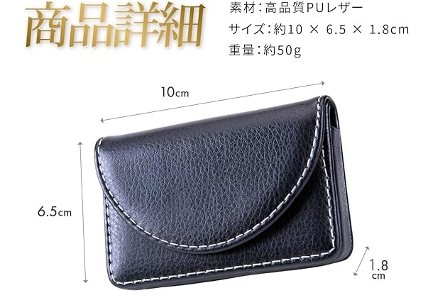 「商品仕様」素材:PUレザー、サイズ:約10cm x 6.5cm x 1.8cm、重量:約50g、収納枚数:10〜20枚(カードの厚みにより変動)