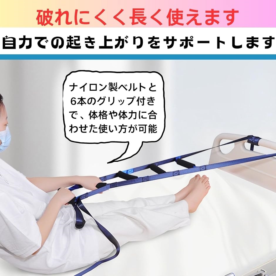 誰でも簡単に使える起き上がり補助ツール ナイロン製ベルトと6本のグリップ付きで、体格や体力に合わせた使い方が可能。