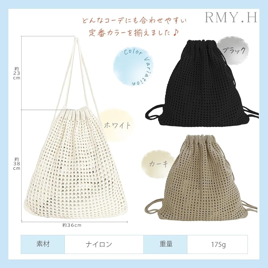 製品仕様 素材:ポリエステルメッシュ カラー:複数カラー展開(例:ブラック/ホワイト/ピンクなど) 開閉:巾着コード式 ポケット:内ポケットなし(中身が見やすい一室構造)