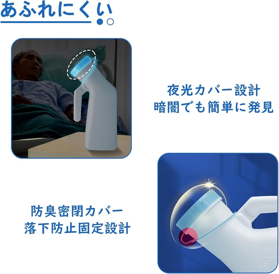 | 商品名 | 尿瓶 しびん 男性用 尿器 口径が広い 1000mL 暗い蓋で光る 大容量 漏れ防止 軽い 持ち運びしやすい 介護 旅行用 ベッドサイド用尿瓶 |