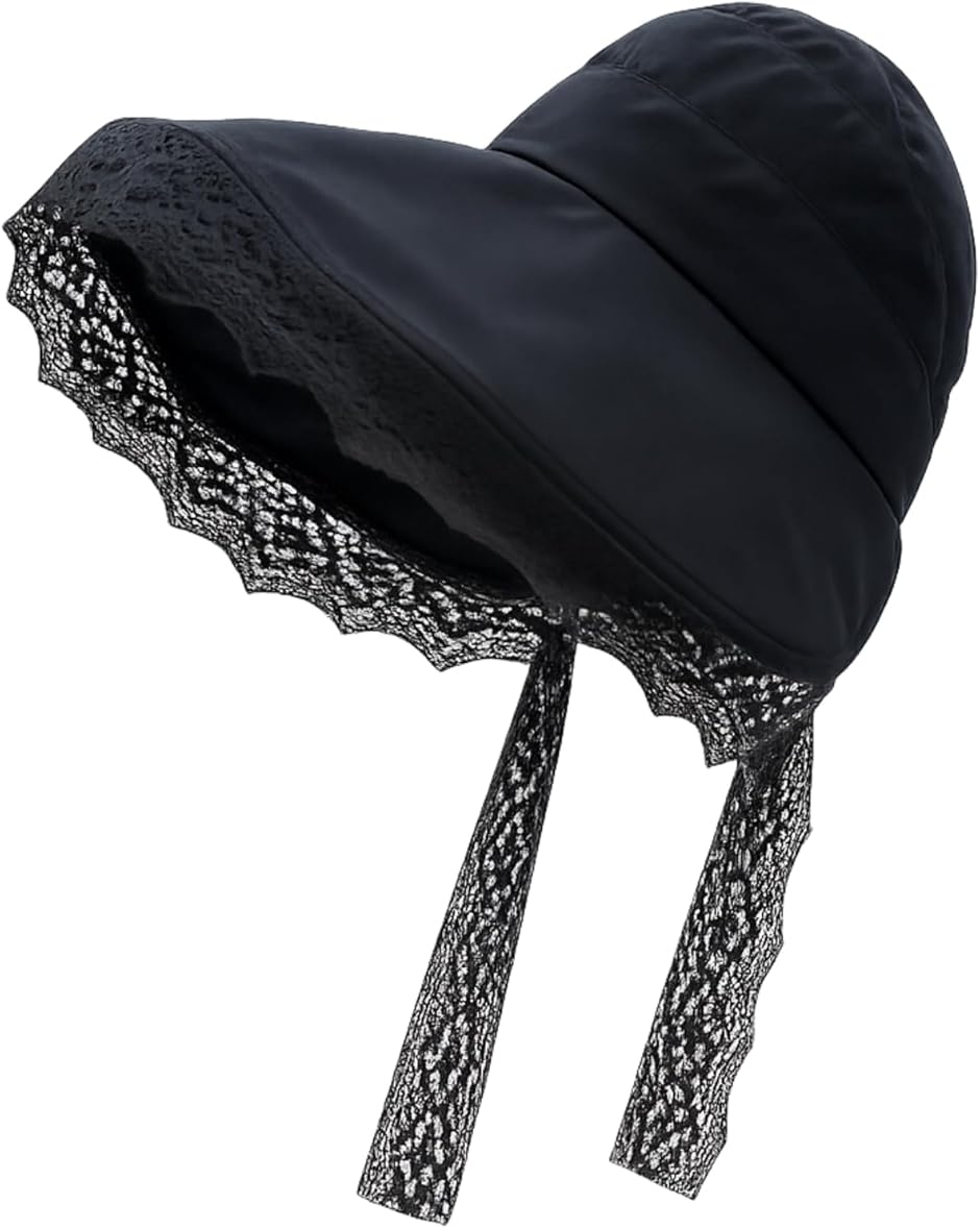 「エレガントなレース使い。おしゃれに紫外線対策」 つばの縁取りから顔輪郭に続いている幅広のレースを顎下で結ぶと、つばが顔周りを軽く包むような形になります。