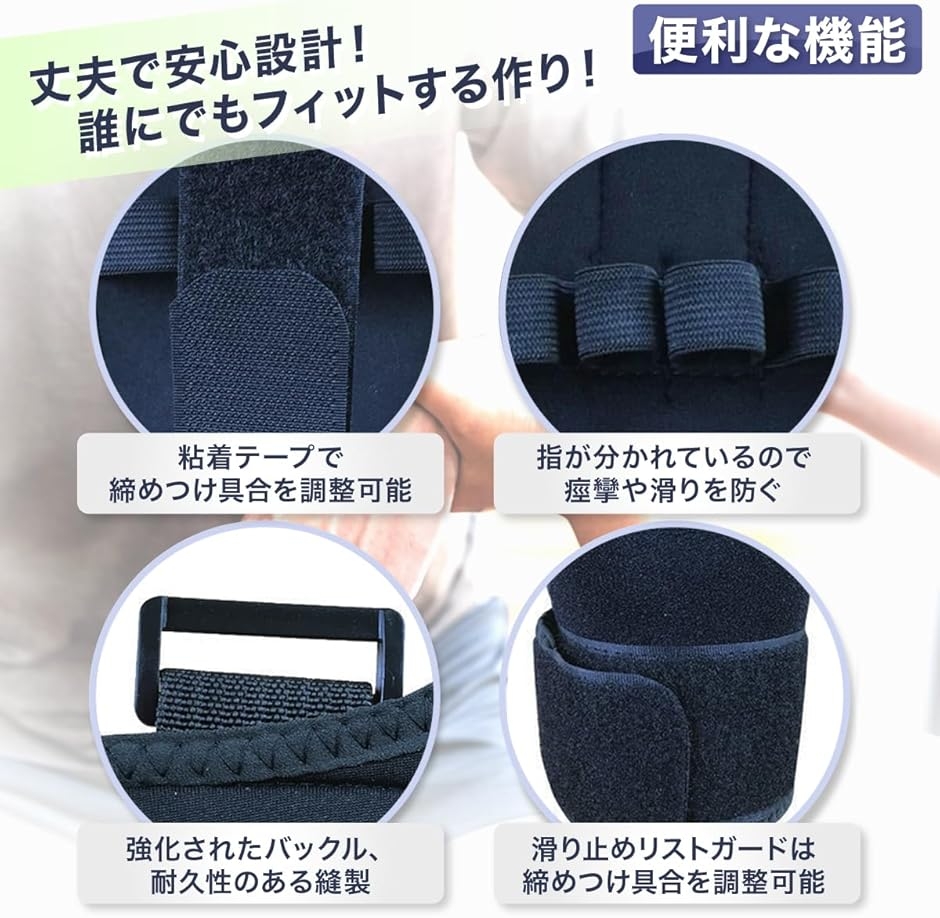 耐久性の高いバックルと丁寧な縫製により長期間のリハビリやフィットネスでも安心して使用でき、丈夫で快適。