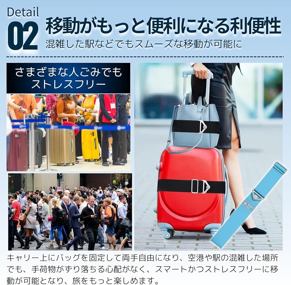 「両手が自由になる。移動を快適にするスーツケースベルト」 旅行や出張での移動をサポートする固定ベルト。