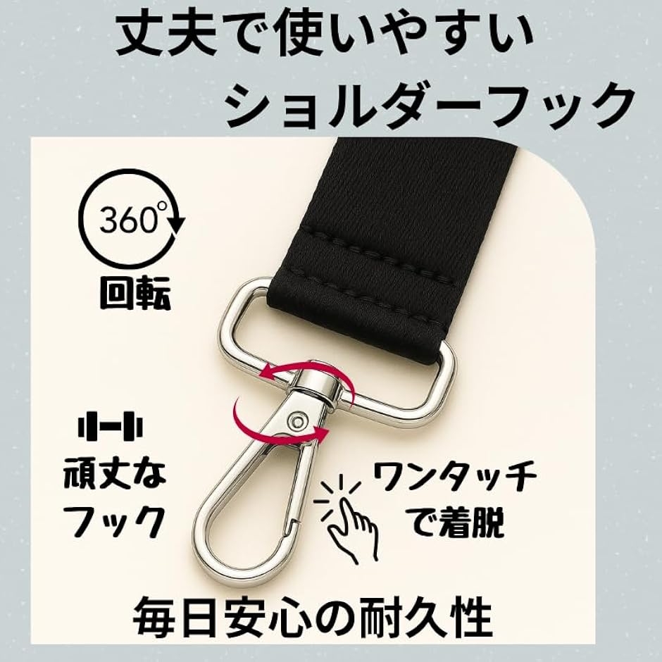 「360度回転フックでストレスフリー」 頑丈なショルダーフックは360°回転&ワンタッチ着脱可能。
