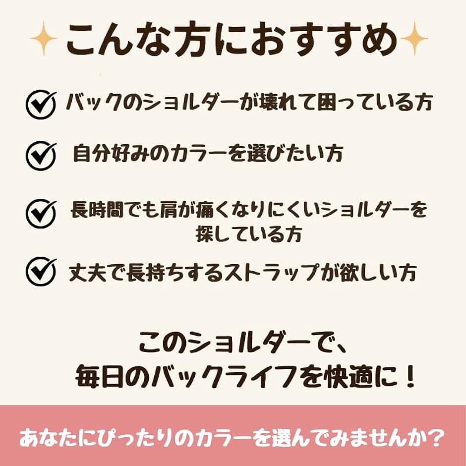 大きめバッグや通勤・通学・旅行用バッグにもおすすめのショルダーベルトです。