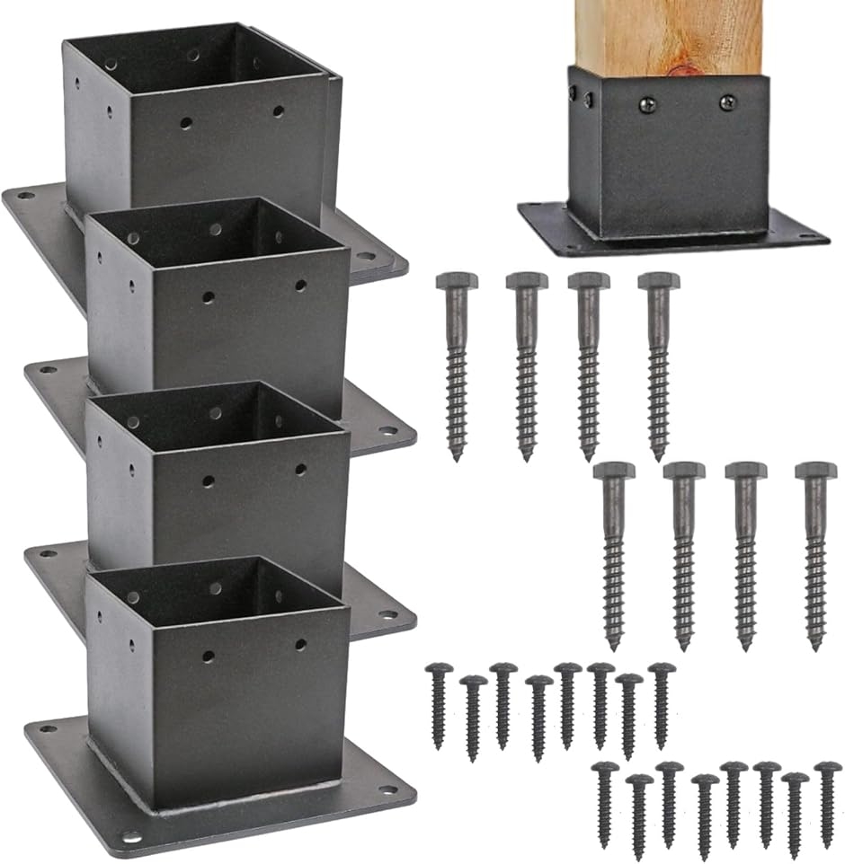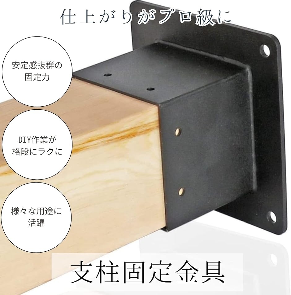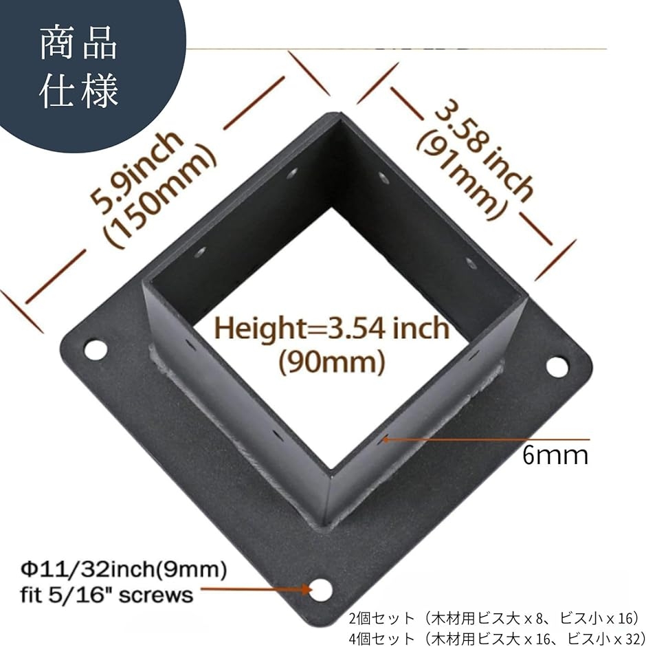 「商品内容」サイズ:(台座)15cm角,ネジ穴直径9mm / (角柱差し込み部)9cm角,ネジ穴直径6mm バリエーション:2個セット(木材用ビス大x8、ビス小x16)/ 4個セット(木材用ビス大x16、ビス小x32)