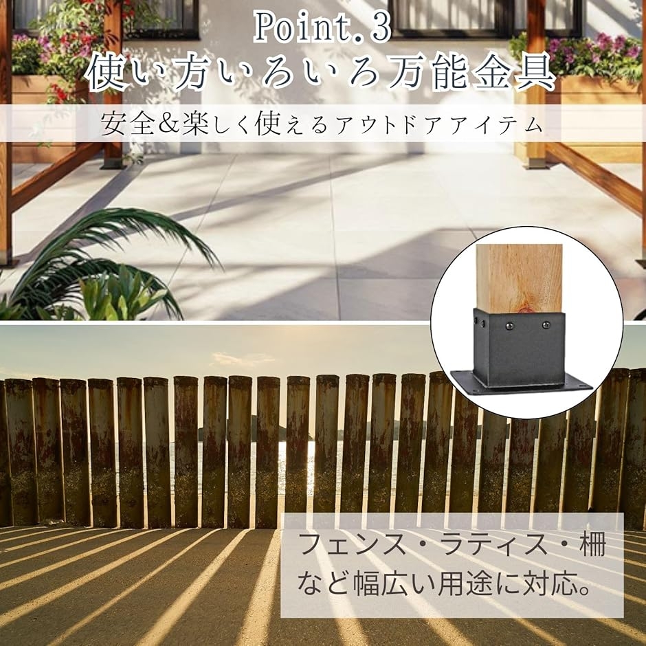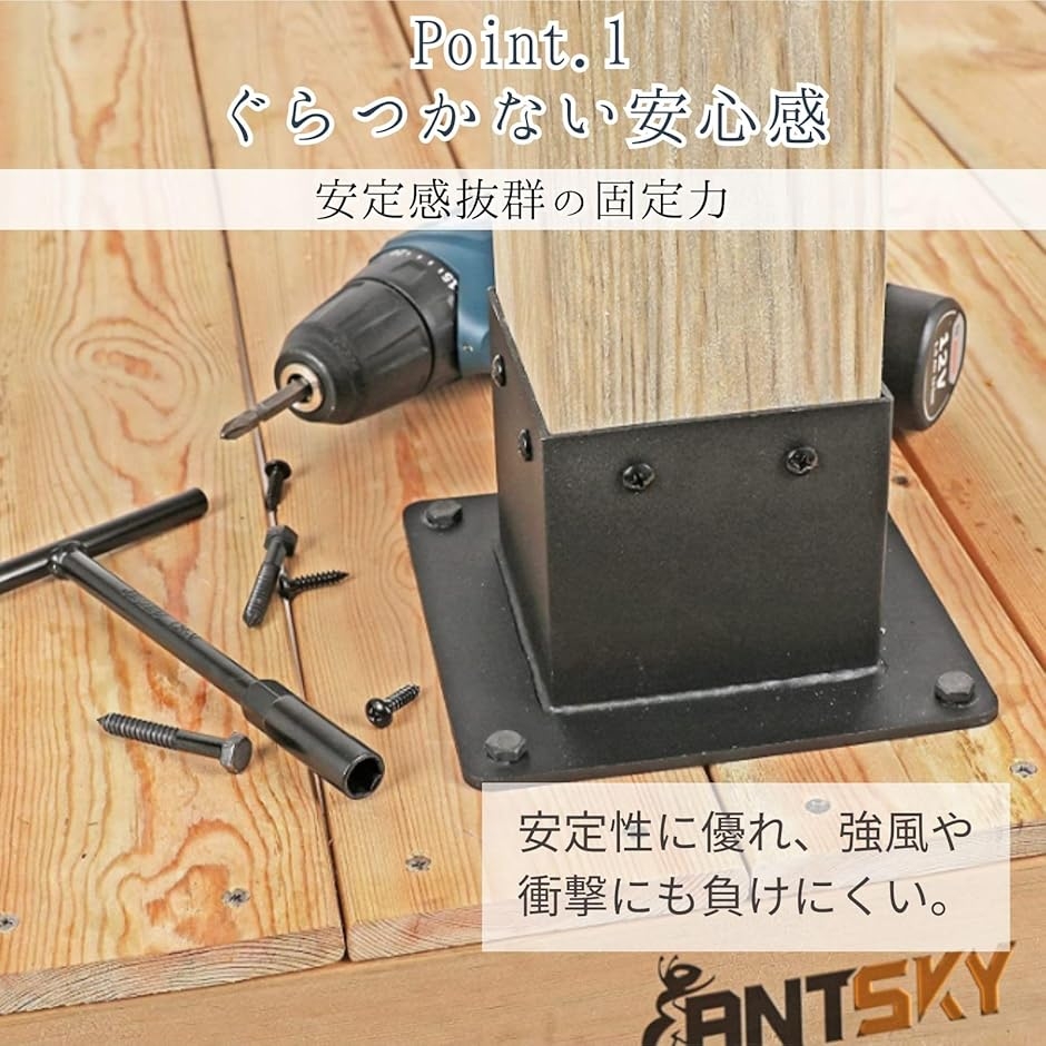 「安定感抜群の固定力」 90mm角の木材支柱をしっかりとホールドし、台風や強風にも負けない安定感を提供します。