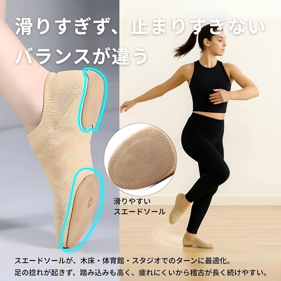 「滑り止めなしでターンに最適化」つま先とかかとのスウェードソールがフローリングや体育館の床をしなやかにとらえ、滑りやすい動作でも引っかかりなく美しく決まる。