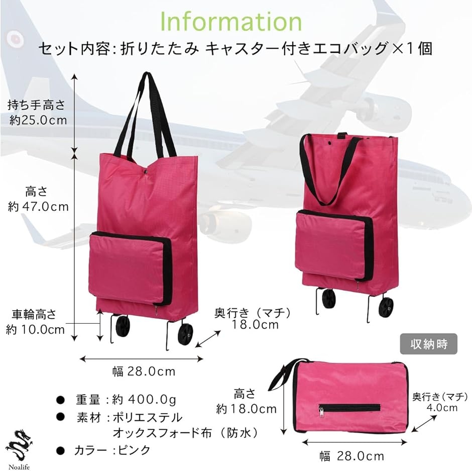 「商品仕様」セット内容:キャリーカート 折りたたみ キャスター付きエコバッグx1個 サイズ (展開時)高さ 約47.0cm 幅 28.0cm 奥行き(マチ) 18.0cm 手提げ紐高さ 約25.0cm(収納時)高さ 約18.0cm 幅 28.0cm 奥行き(マチ) 4.0cm 重量:約400.0g キャスター部 車輪高さ 約10.0cm 素材:ポリエステル オックスフォード布(防水) カラー:オレンジ、ネイビー、 ピンク、ブラック、ライトグリーン、レッド*モニターの環境等により、色の見え方に若干差が生じる場合がございます。