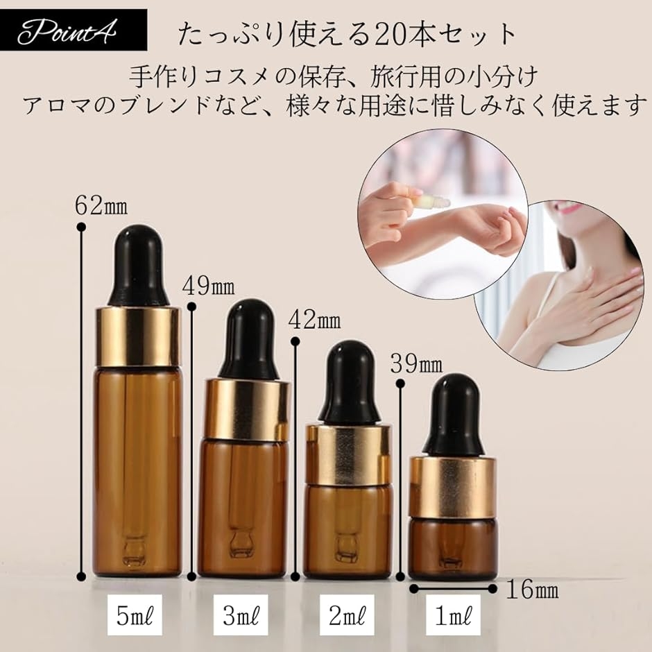 「商品詳細」セット本数:20本 容量:1ml / 2ml / 3ml / 5ml カラー:ブラウン 材質:ガラス、シリコンゴム、PP