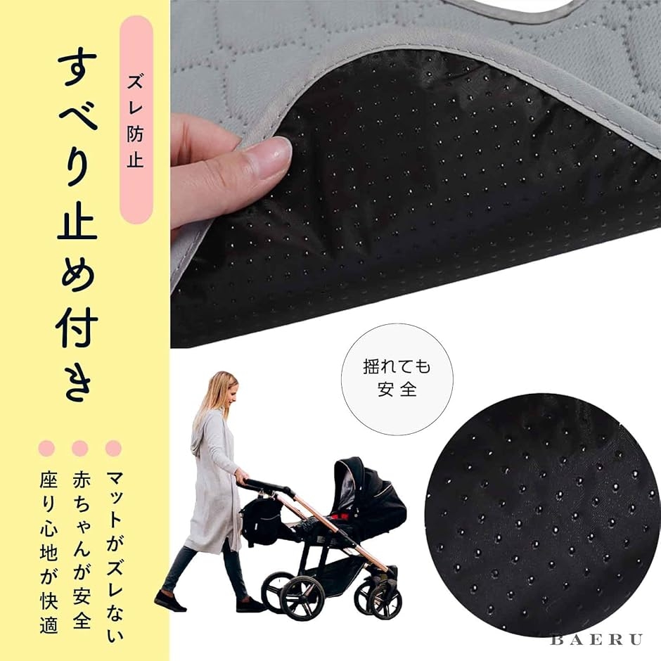 「滑り止め付き」裏面には滑り止め付き。シートがずれたり落ちてしまうのを防ぎ、チャイルドシートやベビーカーをしっかり守ります。