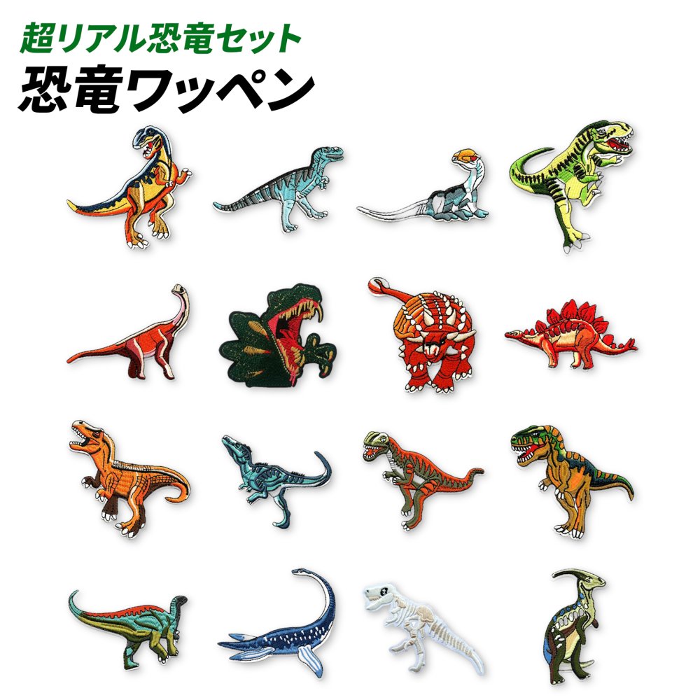 ワッペン 恐竜 ダイナソー アイロン アップリケ 動物 刺繍 子供 幼稚園 保育園 モチーフ 刺しゅう パッチ 装飾 男の子 女の子 (超リアル恐竜セット(16枚))