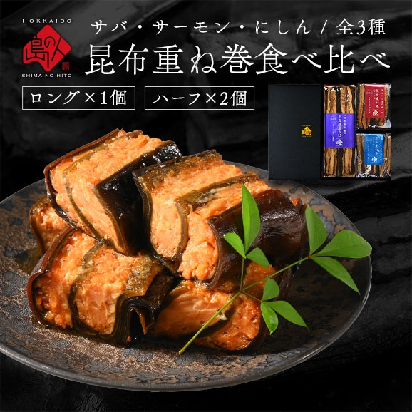 さば重ね巻とハーフ2種 (サーモン、鰊) 食べ比べギフト 化粧箱入 ラッピング さば サバ 鯖 サーモン 鮭 にしん ニシン こんぶ佃煮 利尻昆布 昆布巻 島の人
